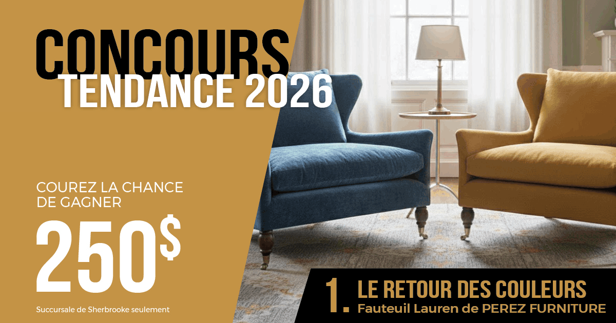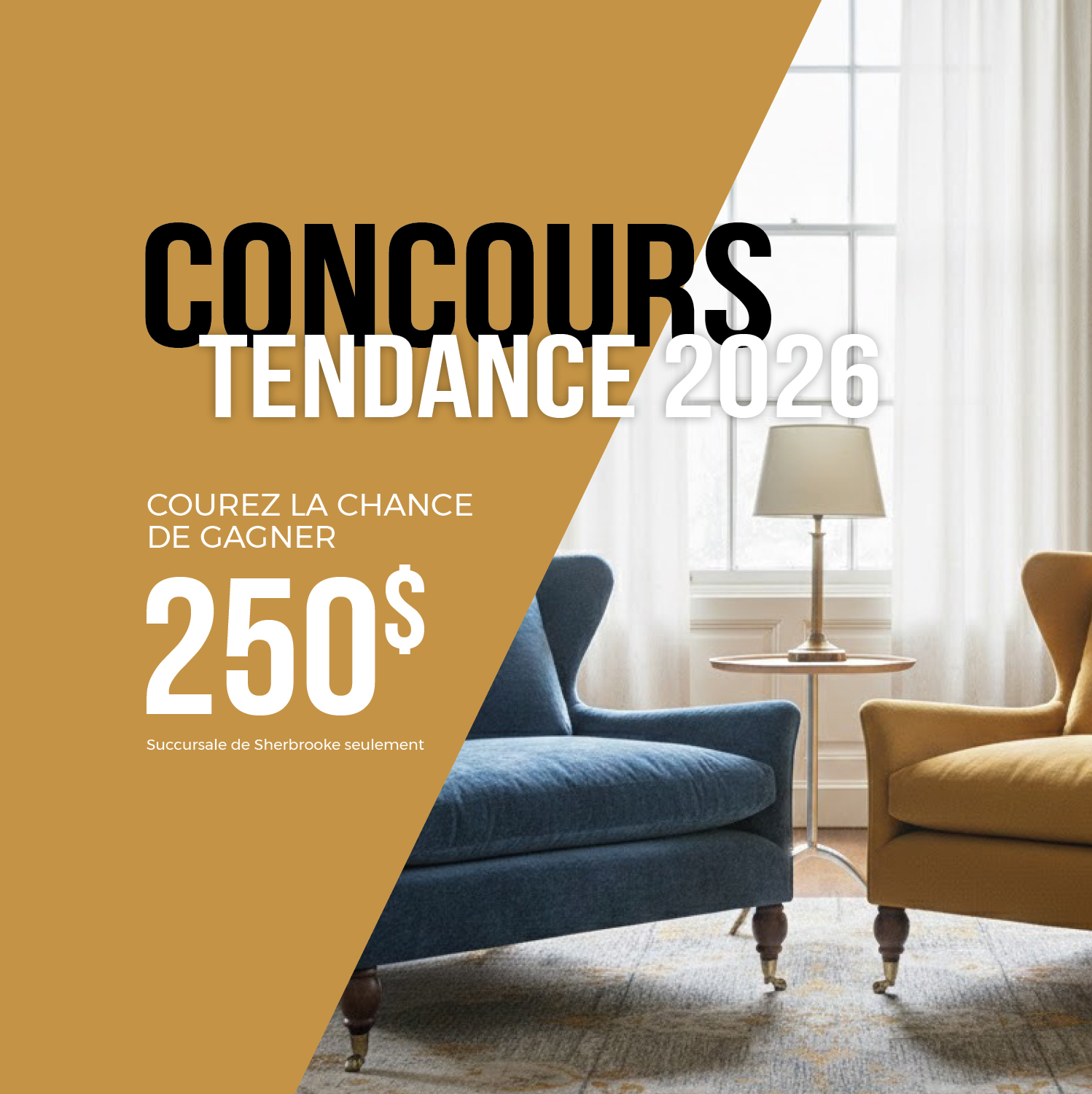 Le concours « Tendance 2026 » commence le 1er mars 2026 et se termine le 31 mars 2026 à minuit, heure de l’Est. Le concours est organisé par l’entreprise Mobilier NorSud, située au 3025, rue King Ouest, à Sherbrooke. À gagner : 1 chèque-cadeau de 250 $.